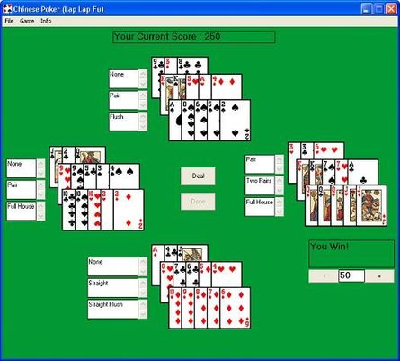 In traditional Chinese Poker, up to four players receive a 13-card hand from a standard 52-card deck. The objective is to arrange these 13 cards into three separate poker hands: