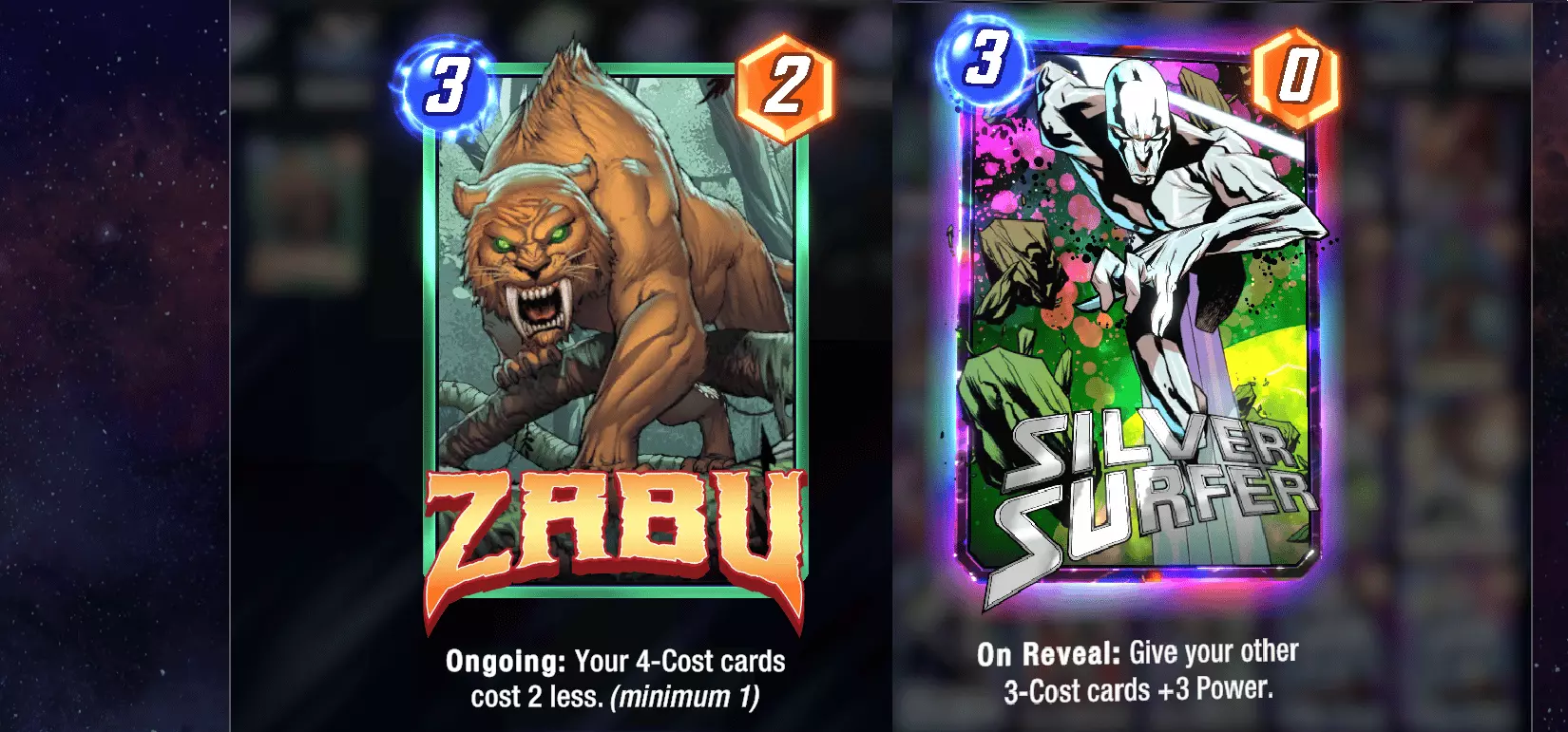 The changes to both cards are both drastic and necessary. Silver Surfer was just granting too much power across the board, making opponents either have Cosmo or just lose the game. On the other hand Zabu was creating too much value by allowing players to play two, reduced-cost four-cost cards on turn four. The tempo swing was massive and rightly was adjusted.